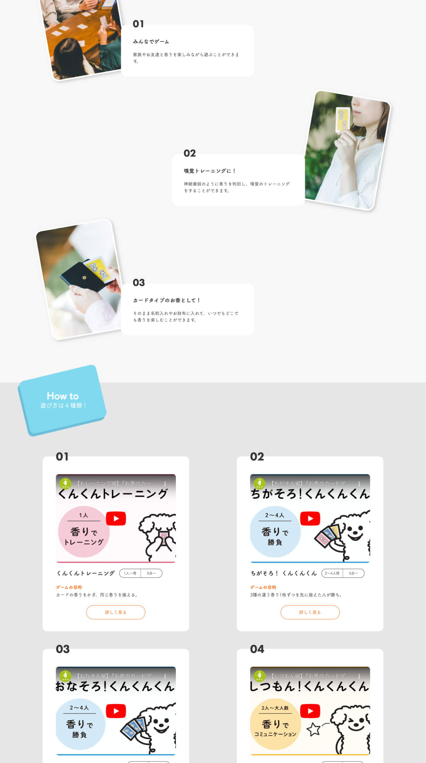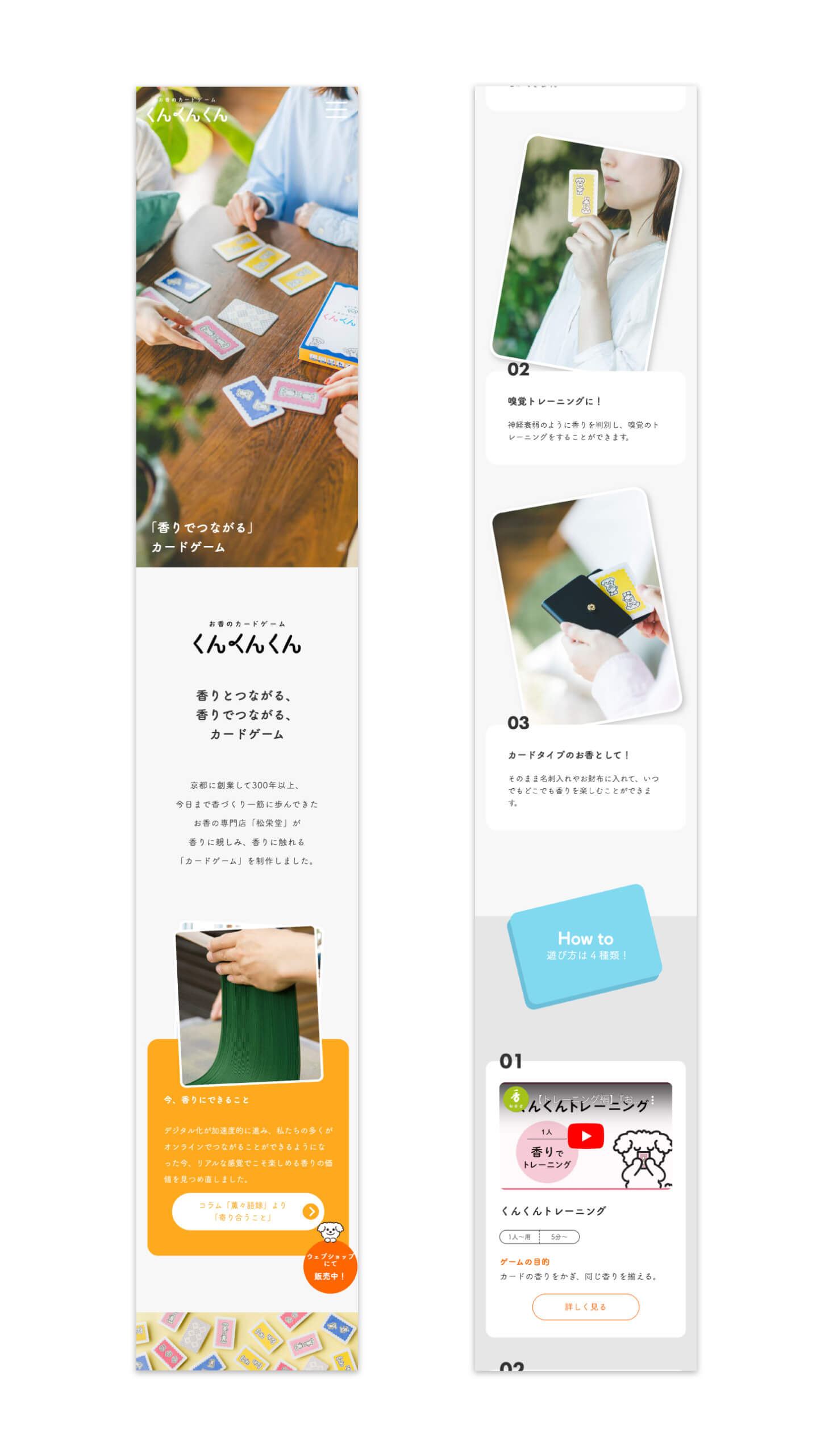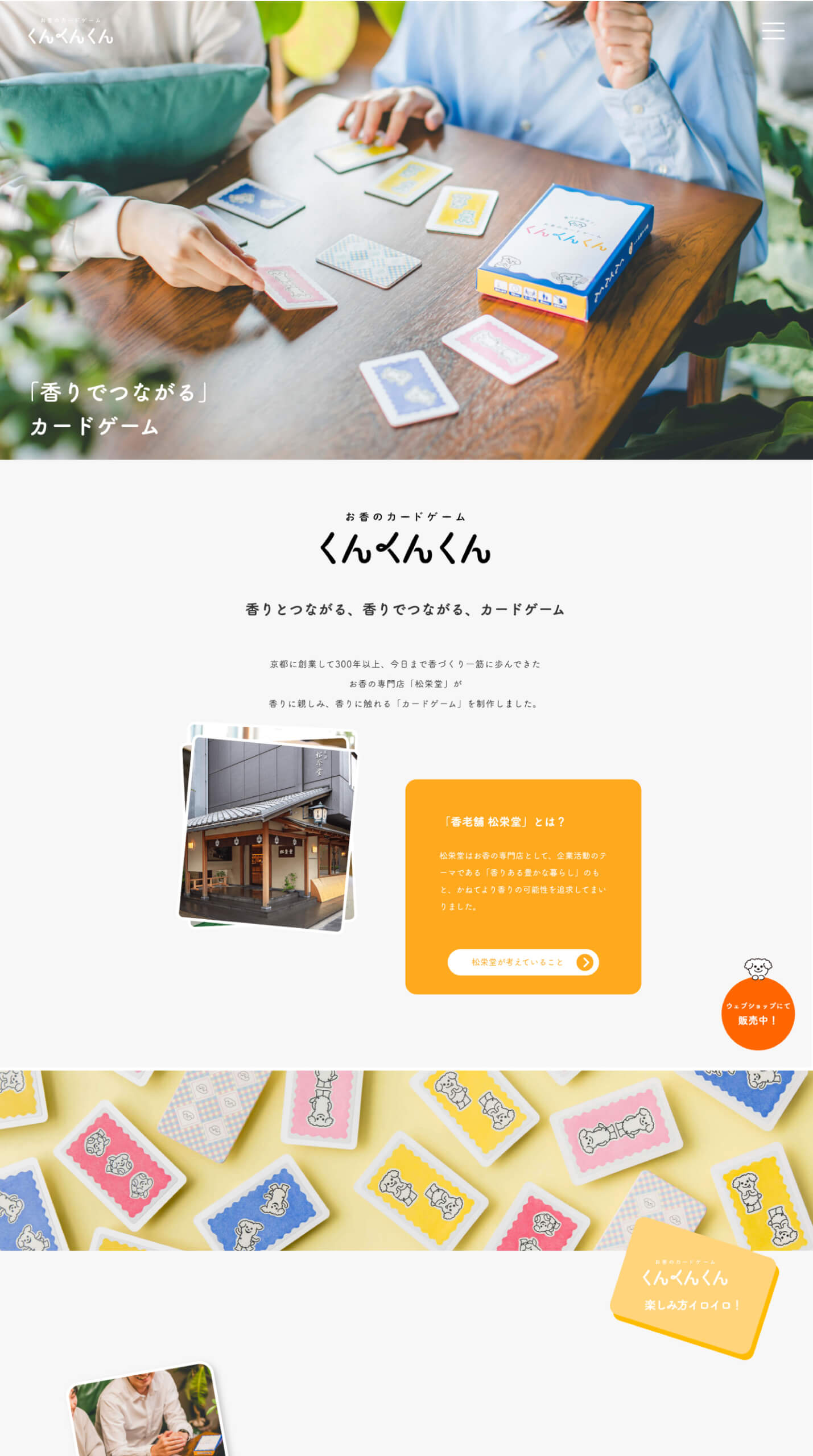 伝統あるお香文化を新しい形で楽しむカードゲーム「くんくんくん」。 その特設サイトでは、ゲームのワクワク感をオンラインでも感じられるよう、明るい色使いと遊び心のあるデザインを採用しました。 ところどころに登場するキャラクター「くんぷー」がアクセントとなり、大人から子どもまで幅広く楽しめる世界観を表現しています。