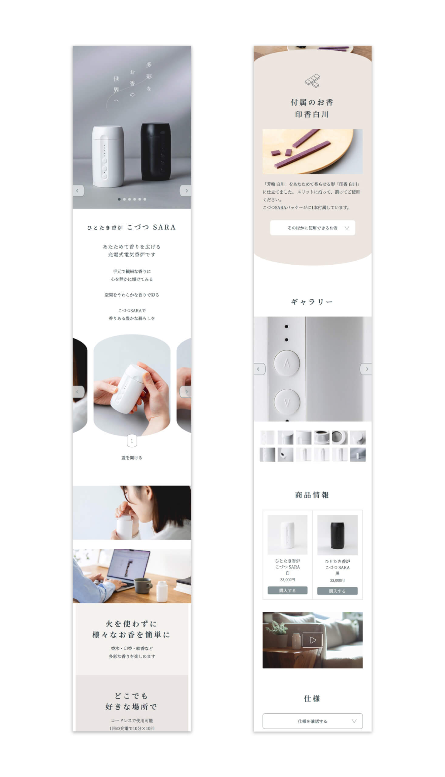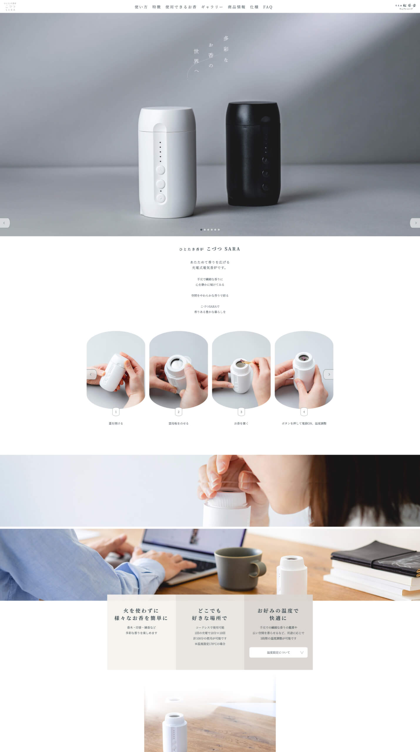 創業300年を超えるお香の老舗・松栄堂が手がけた電子香炉「こづつSALA」。 その特設サイトでは、現代の暮らしに寄り添う新しい香り体験をデザインに落とし込みました。 スマホユーザーを意識した縦型レイアウトと、製品の質感を捉えた接写ギャラリーで、オンラインでも香炉の魅力が五感に響くような構成を目指しました。