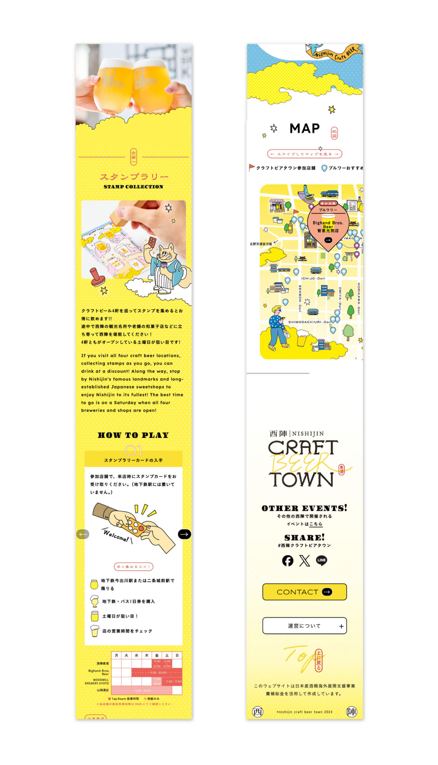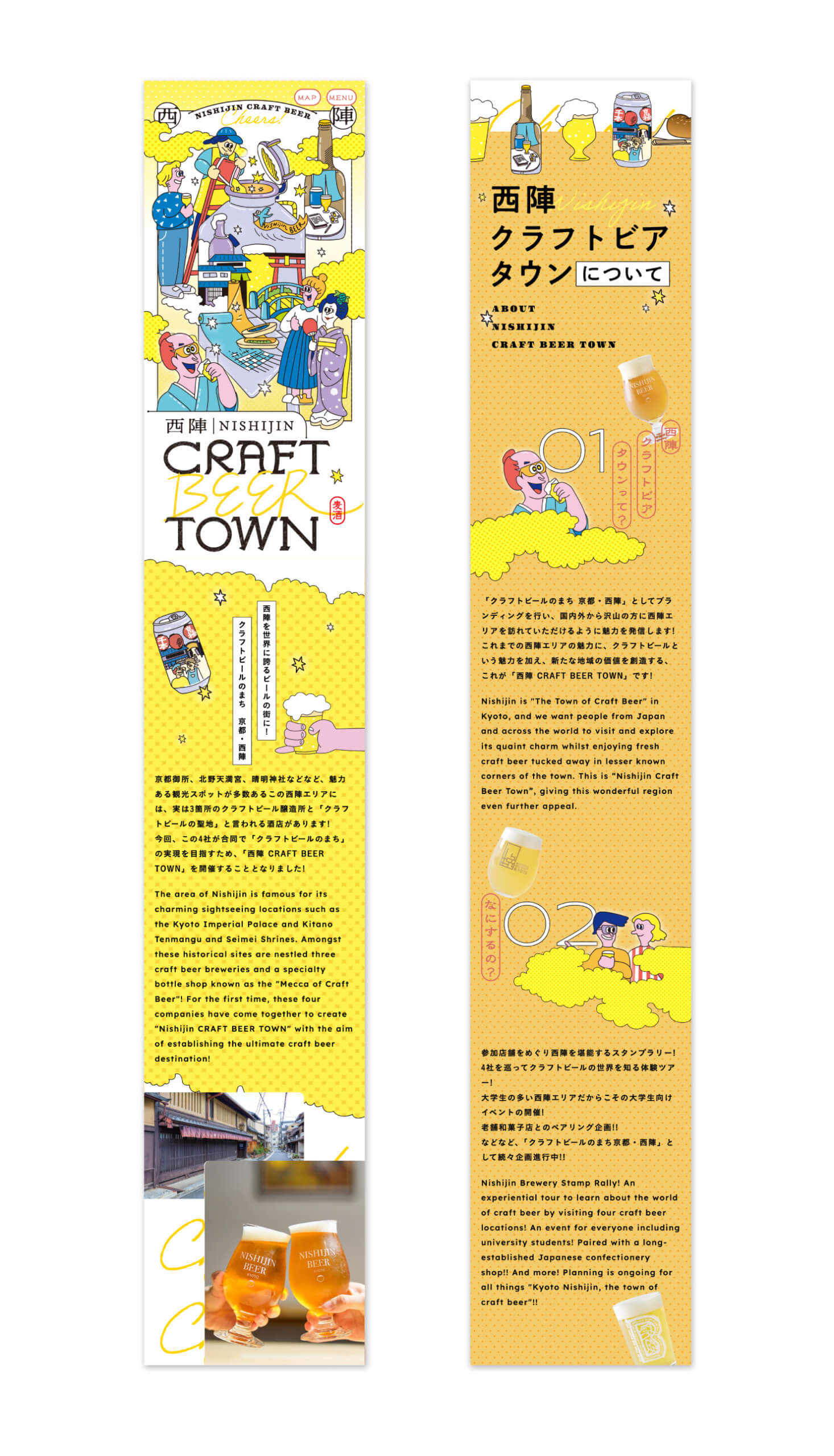 京都・西陣地区の4つの醸造所と酒屋による共同企画の特設サイトを制作。 ポップなイラストを基調に、イベントの楽しさを伝えるデザインとしました。 インバウンドを意識し英語表記を導入するとともに、西陣エリアのマップを組み込み、スマートフォン片手に巡り歩きを楽しめるSPファーストのレイアウトを採用しています。